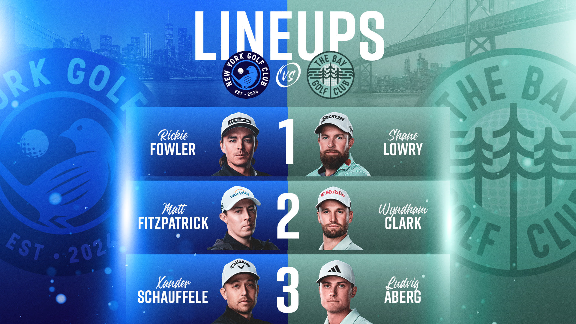 The teams are sent the Course of 15 holes to be played in their match and from there, they choose their three players. For example, New York could choose Matt Fitzpatrick, Rickie Fowler and Xander Schauffele, while The Bay selects Wyndham Clark, Shane Lowry and Ludvig Åberg.