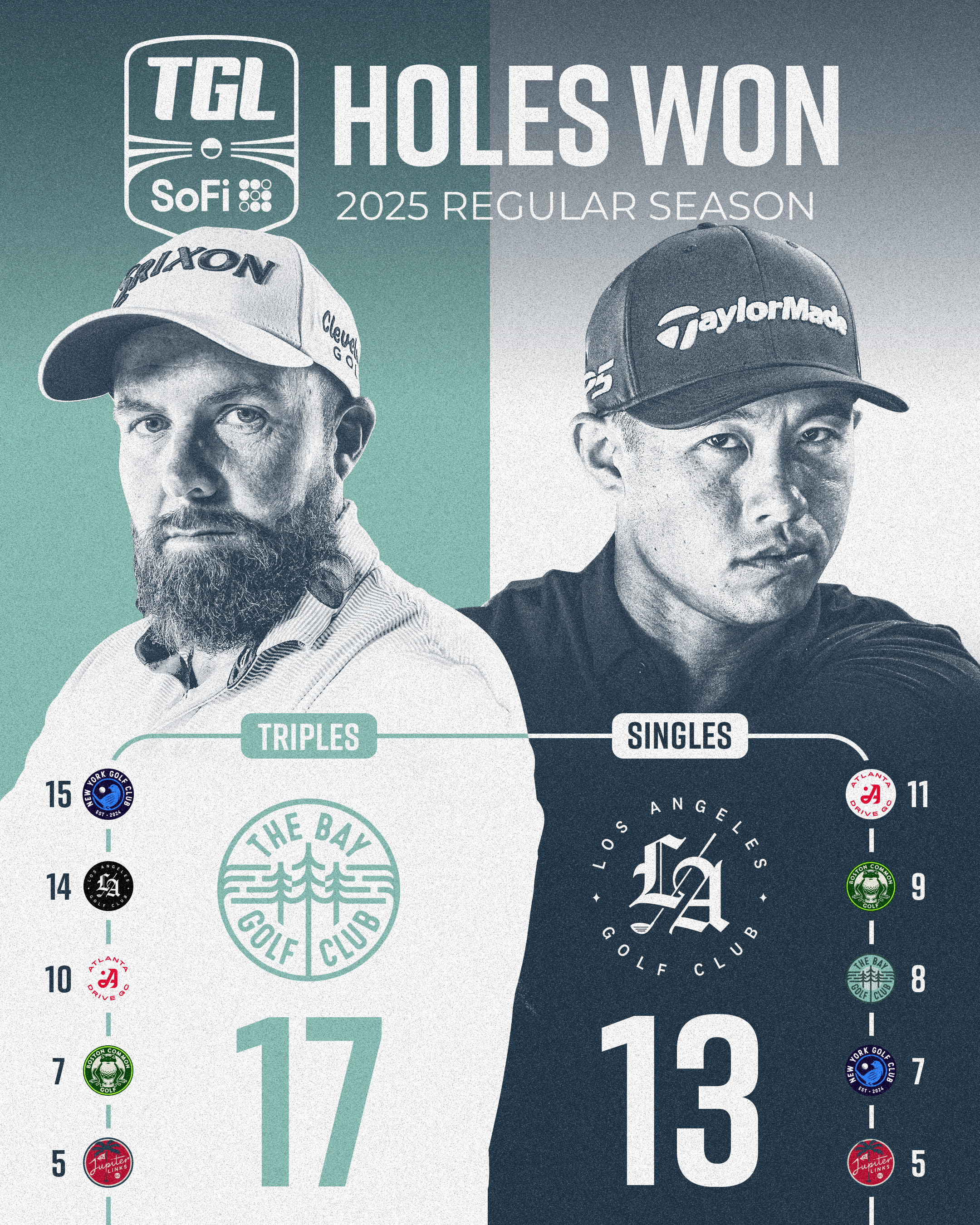 Morikawa wasn’t far off in terms of driving accuracy, finishing T-8 and hitting fairways at a 75% clip. The two-time major champion went unbeaten in Singles play during the regular season and also played a large strategic role in Los Angeles finishing with a +6 Hammer points differential – second in TGL during the regular season behind only champs Atlanta.