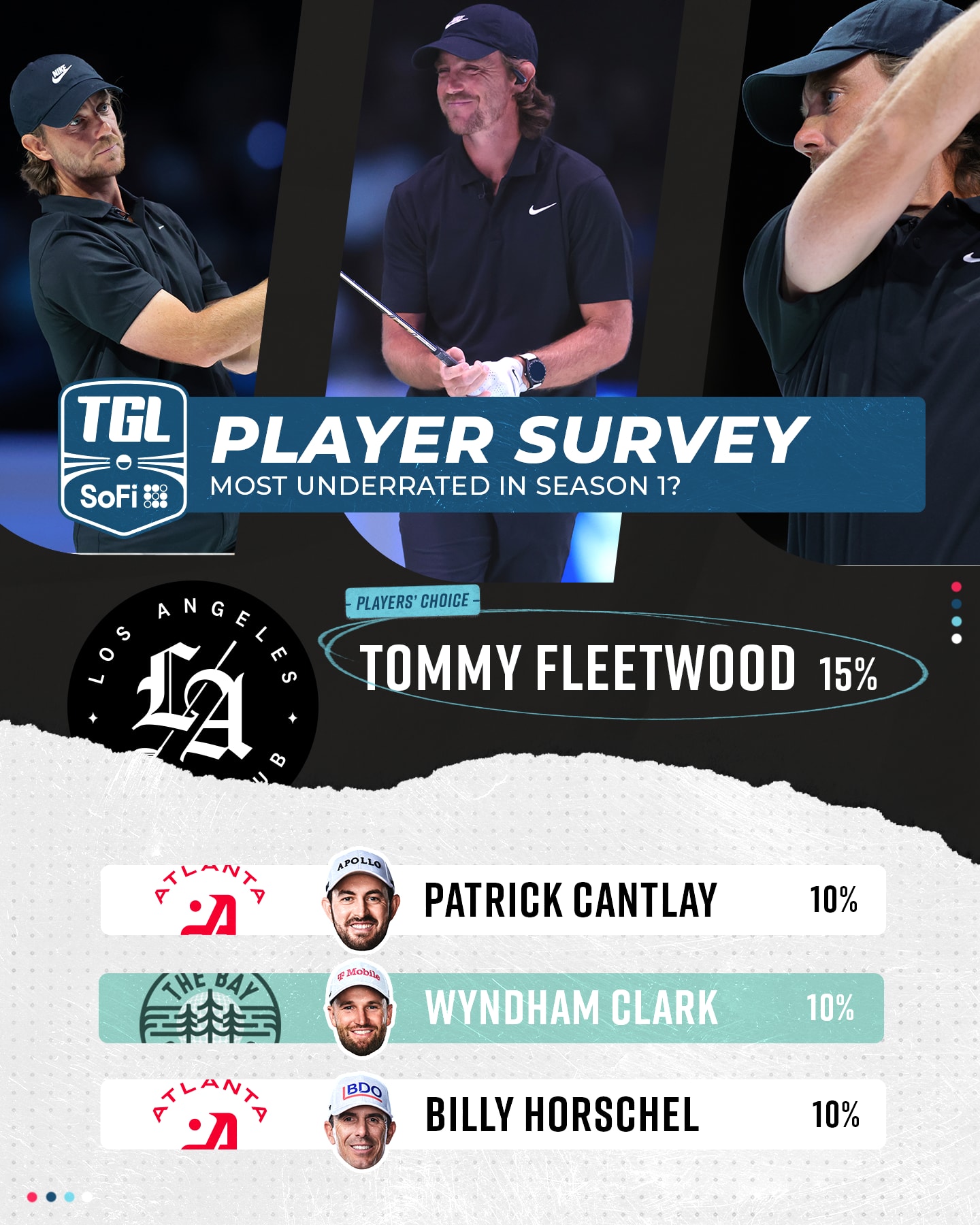 TGL players chose Los Angeles’ Tommy Fleetwood as most underrated, with Cantlay tied for second in the player poll. While not one of the longest hitters in the league, Fleetwood helped LAGC secure the No. 1 overall seed in the regular season with precision and consistency.