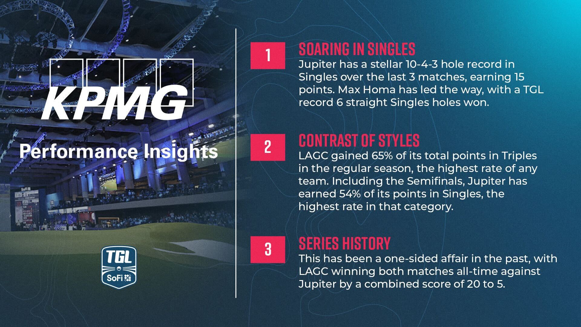 Can Jupiter rely on its hot streak in Singles if it falls behind early? Across both TGL seasons, LAGC is 5-0-1 when leading a match after nine holes. It also enters Monday night a combined 6-0-1 this season on holes 13 and 14, Cut The Sails and Cliffhanger.