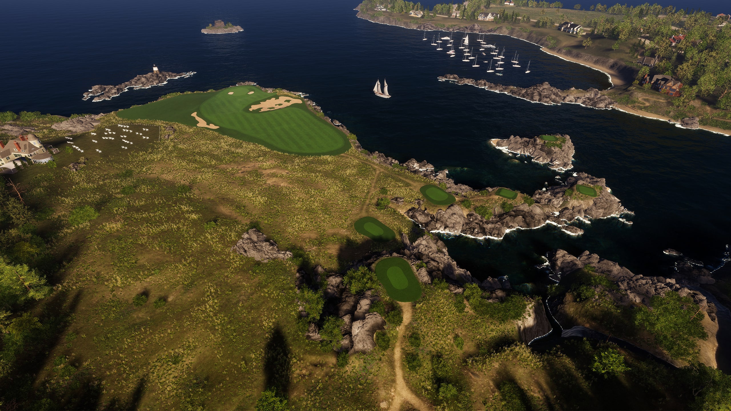 Or take on the risk, fly a cut shot blind over the bunker, trim the sails, and let the slope feed you forward to reveal the green. Miss it too far right and you can kick toward the bay and the sailboats on the horizon.