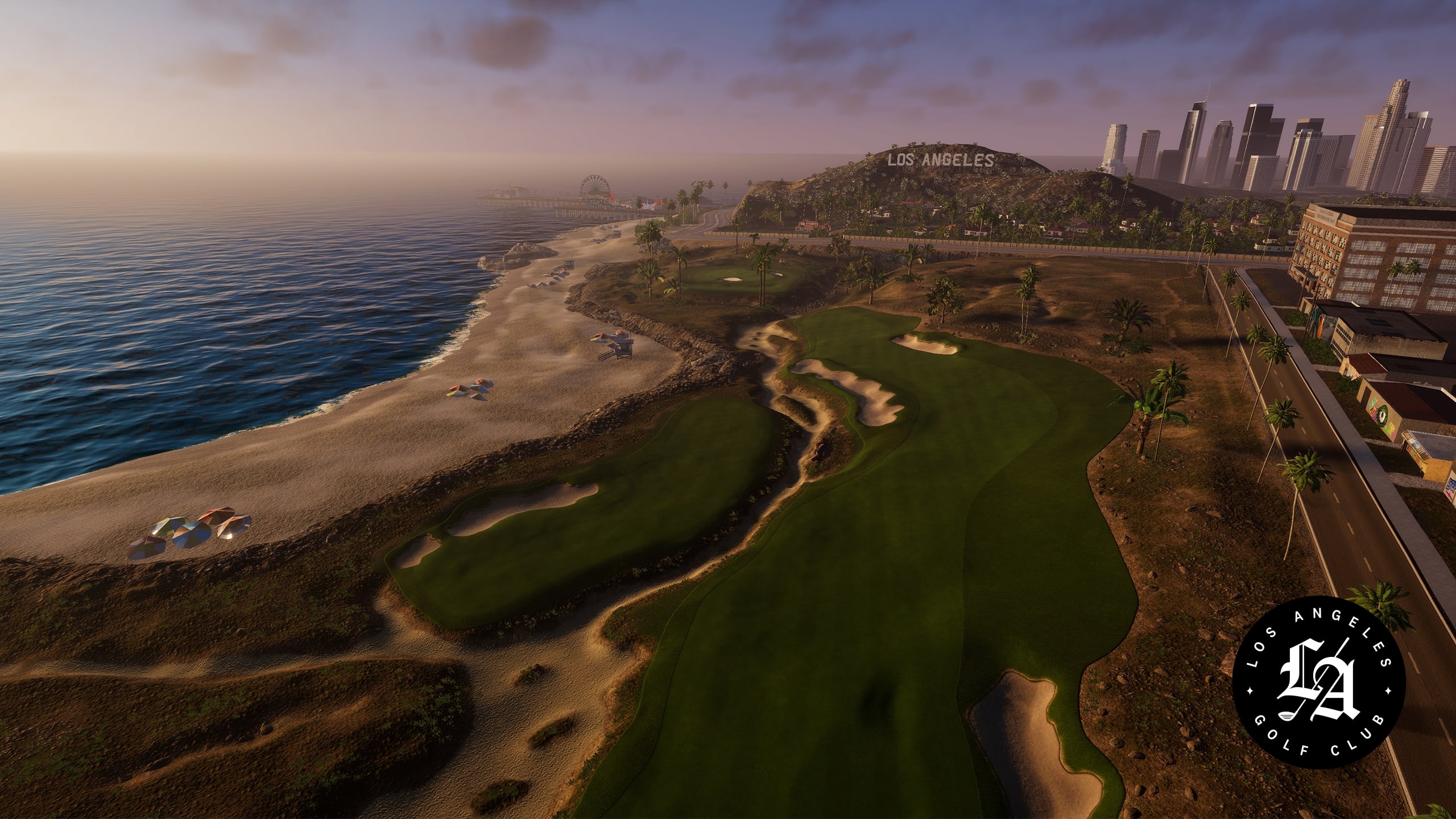 The sunset casts a shadow over the California coastline on this hole, which features several of LA's iconic sights. The tee shot forces players to decide whether to take on the left side of the hole, which features a narrow subset of fairway surrounded by penalty area, or bail out to the right.