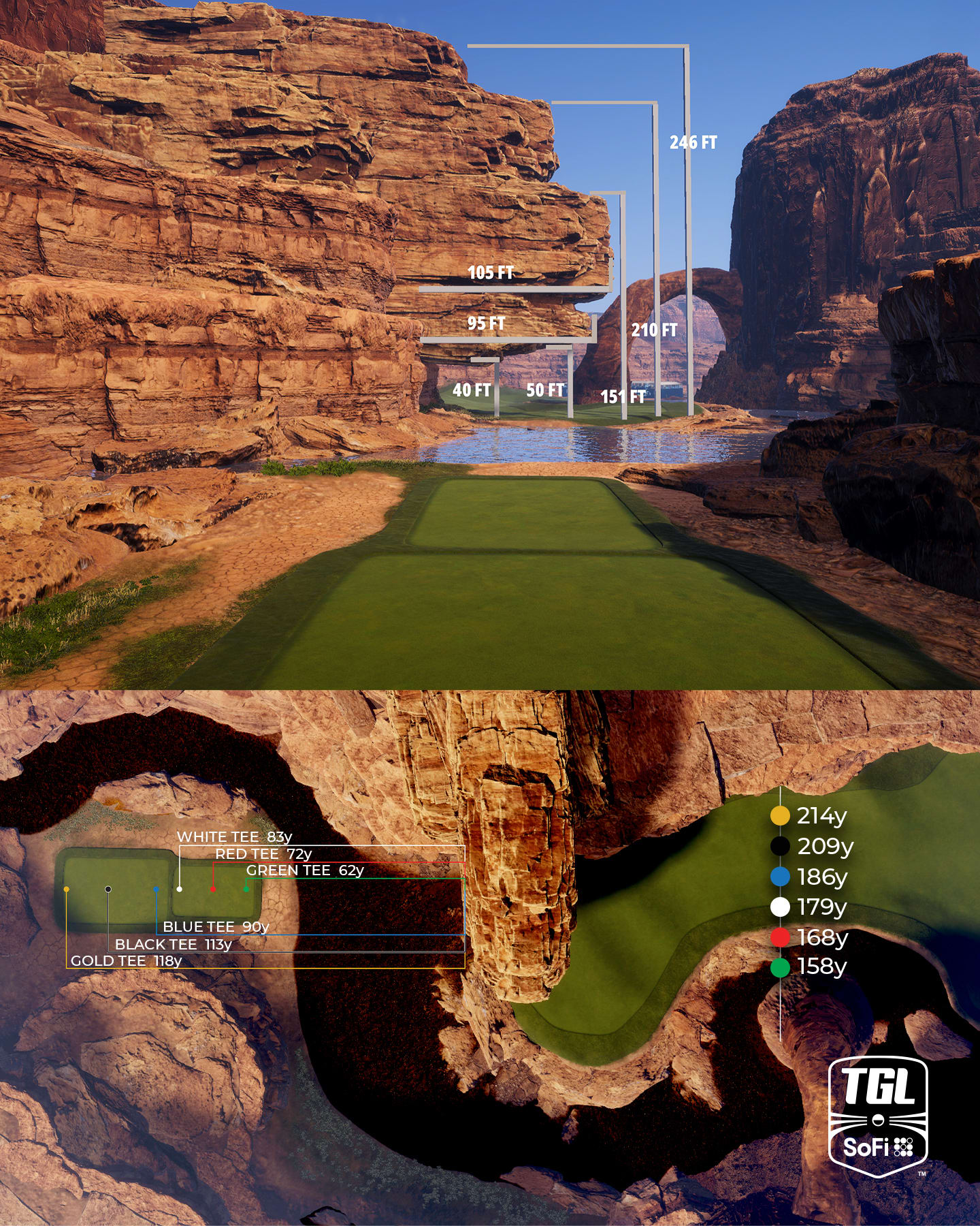 "The first way is to take on that stinger, which will play at an apex of around 45 ft within the rock feature in front of the tee box. If you that stinger well, your ball should hit the speed slot and trickle to Position A, about 160 yards away from the GreenZone.